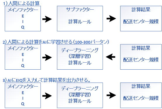 | 結論から言いますと出来ます。 鈴木震先生は、「発送先数(E)・アイテム数(I)・バラ数(Q)はメインファクターである」と言ってます。 メインファクターが有ると言うことはサブファクターもあると言うことです。 サブファクターとは計算ルールです。 ![]() 上記は、サブファクターの一例です。 サブファクターの数を増やせば計算精度が上がります。 Tera計算では300程のファクターがあり、配送センタ規模を計算してます。 鈴木震先生は、「EIQと配送センター規模はフラクタル」とも言っとてます。 ある業種の配送センター規模がモミジの葉としたら、EIQの変化によってモミジの葉が大きくなるか小さくなるかで、桜の花に変化することは無い。 EIQが解れば計算ルール(サブファクター)が一定だから、計算ルールを知らなくても答えが出る、と言ってるのですね。 ![]() 機械学習の概念が生まれたのは1950年で、ディープラーニング(深層学習)が普及し始めたのは2010年ごろから、だそうです。 2000年初頭に、EIQで配送センター規模出来ると言われた鈴木新先生凄いですね。 現在、上記1)の段階ですが、2)の計画を進めてます。 3)で出力された配送センター規模が、1)で計算した配送センター規模と、どの位の誤差があるか楽しみです。 E・I・Qで配送センター規模が計算できることを証明したいですね。 |